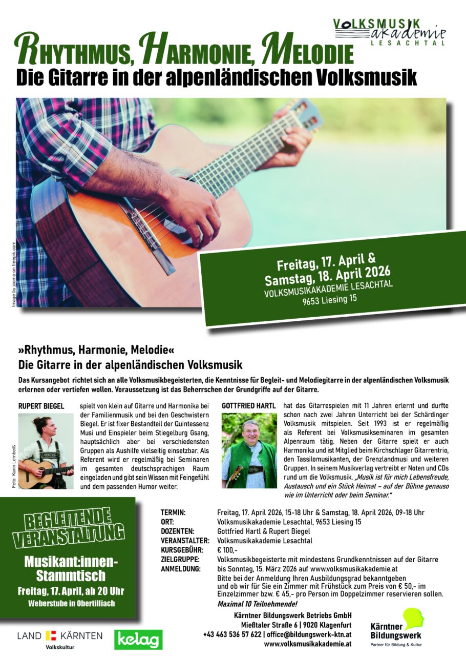 Plakat für VMA Seminar "Die Gitarre in der alpenländischen Volksmusik" 17 und 18.4.2026 - Volksmusikakademie Lesachtal